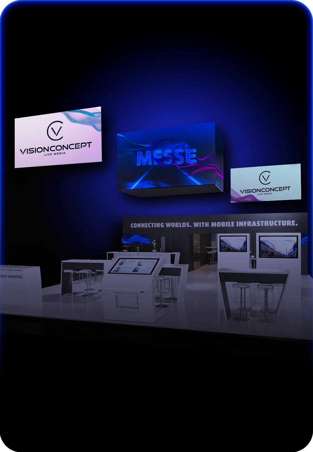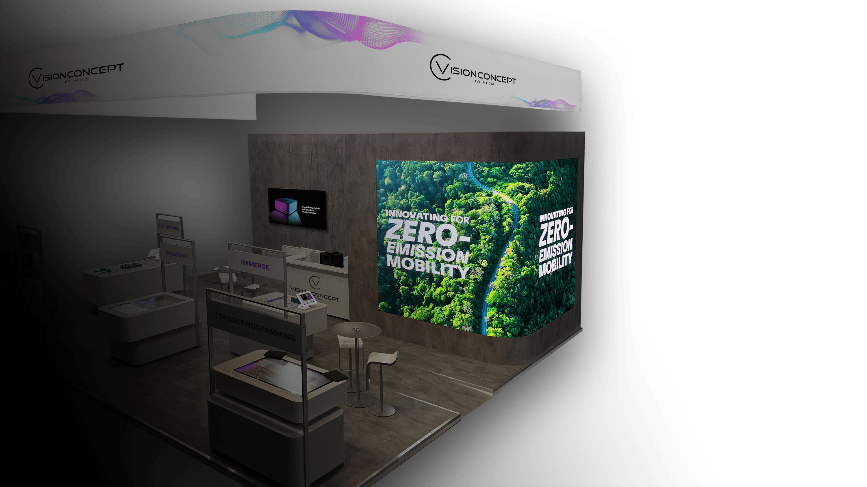 Durch die Aufbereitung bestehender Werbeinhalte und die Vernetzung zusätzlicher Systeme wie Sensorik, Licht oder Audio lassen sich Inhalte kontextbezogen ausspielen und gezielt hervorheben. So entsteht ein immersiver Messeauftritt.